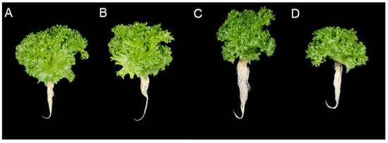 “Frillice” lettuce at harvest (28 DAT in a hydroponic system) according to seedling grades ((A) grade A, (B) grade B, (C) grade C, (D) grade D).