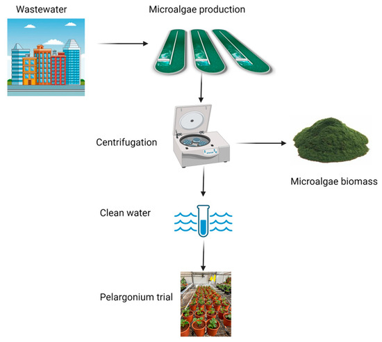 Five key components have been identified in cleaner production, namely, the conservation of raw materials, water, and energy, as well as the elimination of toxic emissions and waste reduction [8]. Industrial water production technologies, such as desalination and water reuse, are crucial tools for addressing water scarcity, adapting to climate change, and promoting a circular economy [9]. The water recycling technology involves capturing and recycling irrigation water to enhance water productivity in crops, bolstering supply security, and reducing contaminants at production sites [10]. In developing countries, farmers often resort to using untreated wastewater directly for irrigation, which raises health concerns for both workers and consumers. To address this problem, a microalgae-based wastewater treatment is suggested as a strategy to recover nutrients and produce clean water [11,12]. Microalgae-–bacterium consortia in wastewater treatment processes offer a dual function by removing nutrients and contaminants while producing valuable biomass [11,13], with the potential to serve as sustainable sources of food, animal feed, fuel, biostimulants, and biofertilizers [13,14]. It has been demonstrated that microalgae-based wastewater treatment is an economical and sustainable solution [6]. Microalgae play a crucial role in removing various types of toxins through biosorption, bioaccumulation, and biodegradation processes [6]. Wastewater serves as a readily available, low-cost, and nutrient-rich medium for cultivating algae [5]. Additionally, due to their ability to remove organic matter, nutrients (such as N and P), and certain contaminants [13,15], microalgae hold a dominant role in microalgae-based wastewater treatment and in ensuring reduced nutrient inputs to receiving water bodies [5]. Thus, microalgae-based techniques have recently gained significant attention for treating municipal, industrial, agro-industrial, and livestock wastewater [6].