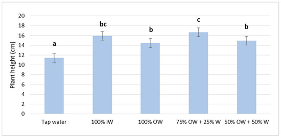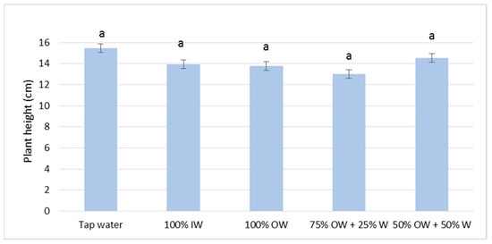 The height (cm) of Pelargonium × hortorum plants irrigated with microalgae wastewater during the autumn season. The results are presented as means with standard error. Columns with different letters indicate significant differences (p ˂ 0.05) based on LSD. Tap water (control 1); 100% IW—inlet wastewater (control 2); 100% OW—outlet from the reactor; 75% OW + 25% W—75% outlet from the reactor and 25% tap water; and 50% OW + 50% W—50% outlet from the reactor and 50% tap water.