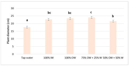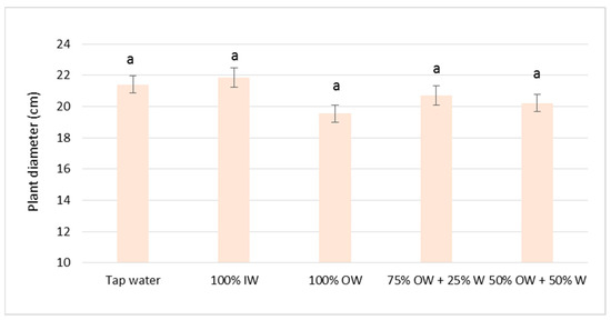 The diameter (cm) of Pelargonium × hortorum plants irrigated with microalgae wastewater during the autumn season. The results are presented as means with standard error. Columns with different letters indicate significant differences (p ˂ 0.05) based on LSD. Tap water (control 1); 100% IW—inlet wastewater (control 2); 100% OW—outlet from the reactor; 75% OW + 25% W—75% outlet from the reactor and 25% tap water; and 50% OW + 50% W—50% outlet from the reactor and 50% tap water.