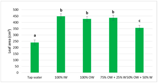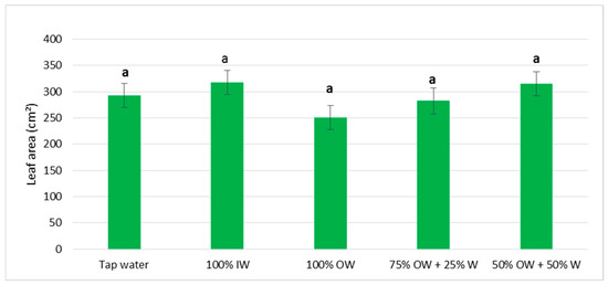 The leaf area (cm2) of Pelargonium × hortorum plants irrigated with microalgae wastewater during the autumn season. The results are presented as means with standard error. Columns with different letters indicate significant differences (p ˂ 0.05) based on LSD. Tap water (control 1); 100% IW—inlet wastewater (control 2); 100% OW—outlet from the reactor; 75% OW + 25%—W 75% outlet from the reactor and 25% tap water; and 50% OW + 50% W—50% outlet from the reactor and 50% tap water.