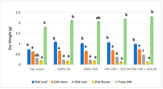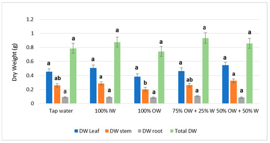 The dry weight (g) of Pelargonium × hortorum plants irrigated with microalgae wastewater during the autumn season. The results are presented as means with standard error. Columns with different letters indicate significant differences (p ˂ 0.05) based on LSD. Tap water (control 1); 100% IW—inlet wastewater (control 2); 100% OW—outlet from the reactor, 75% OW + 25% W—75% outlet from the reactor and 25% tap water; and 50% OW + 50% W—50% outlet from the reactor and 50% tap water.