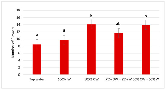The number of flowers in Pelargonium × hortorum plants irrigated with microalgae wastewater during the spring season. The results are presented as means with standard error. Columns with different letters indicate significant differences (p ˂ 0.05) based on LSD. Tap water (control 1); 100% IW—inlet wastewater (control 2); 100% OW—outlet from the reactor; 75% OW + 25% W—75% outlet from the reactor and 25% tap water; and 50% OW + 50% W—50% outlet from the reactor and 50% tap water.