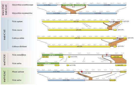 Our study revealed a striking pattern of tRNA loss events in Papilionoideae pttRNAs (Table 1). Notably, eight tRNA genes were missing, with a clear bias towards the IRLC class. Six losses occurred in IRLC taxa, with two in trnI-CAU, and one in each of trnA-UGC, trnI-GAU, trnT-UGU, and trnV-GAC, respectively. In contrast, the non-IRLC class only occupied losses in the trnH-GUG gene (twice). To further untangle these loss events, meticulous alignments were conducted combining both sequences and annotations. Notably, the results indicated three various causes that might lead to the tRNA losses, as illustrated in Figure 1. Deletion events accounted for the most cases, including the absence of trnA-UGC and trnI-GAU from Glycyrrhiza asymmetrica (each missing an exon), and trnV-GAC from Vicia sativa. However, the losses of trnT-UGU in Vicia sativa, as well as of trnI-CAU in Vicia cracca and Callerya dielsiana, involved more complex mechanisms as follows: deletion–insertion and deletion–rearrangement events, respectively. It is important to note that the losses of trnH-GUG appeared to be due to incomplete sequencing, especially reflected by the annotated fragmented IR regions.