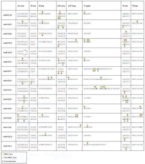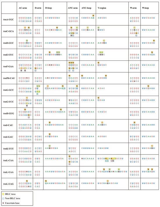In addition, we compared individual consensus sequences of pttRNAs between the IRLC and non-IRLC classes. Significantly, the results showed that inter-lineage variations occurred across all tRNAs, with the only exception of trnR-ACG (Figure 2). Almost all these variations emerged at single base positions, spanning the stems and loops at the secondary structural level. To quantify these variations, we calculated the mutation rates for various structural regions. This involved dividing the number of mutated position positions by the total sequence size of the corresponding region (Table S2a). Notably, the pttRNAs of IRLC and non-IRLC taxa varied most greatly in trnC-GCA (0.1549), followed by trnV-GAC (0.1528) and trnF-GAA (0.1233). Among the eight structural regions of tRNA, the V-regions accounted for most of the inter-lineage pttRNA differences, with mutation rates significantly higher than other regions (p < 0.05) (Table S2b). Interestingly, a more detailed analysis of the mutated positions indicated a substitution bias in IRLC pttRNAs toward A or U bases (54.90%) compared to non-IRLC pttRNAs (46.25%). Additionally, the IRLC group contained approximately twice the number of uncertain bases as “other clade”.