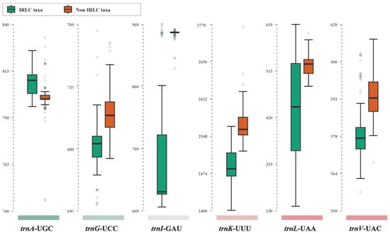 Boxplot of intron sizes of six isoacceptor tRNAs between IRLC and non-IRLC chloroplasts. The upper and lower bounds of each box represented the Q3 and Q1 quartiles. The thick line in each box indicated the median value. The horizontal lines extending from the top and bottom of the box represent the maximum and minimum values. The dots denoted the outliers.