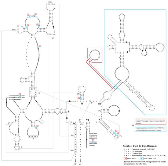 Predicted secondary structures of the consensus sequences of IRLC and non-IRLC trnI-GAU introns. The variations were highlighted with red boxes for IRLC group and blue boxes for non-IRLC group. Note that IBS = internal binding site and EBS = external binding site.