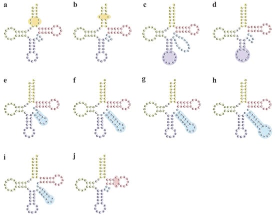 Putative secondary structures of atypical pttRNAs in Papilionoideae taxa. The specific non-typical structures were marked with circles. (a) trnR-ACG. (b) trnT-UGU. (c) trnL-UAA. (d) trnV-UAC. (e) trnL-CAA. (f) trnS-GCU. (g) trnS-GGA. (h) trnS-UGA. (i) trnY-GUA. (j) trnC-GCA.