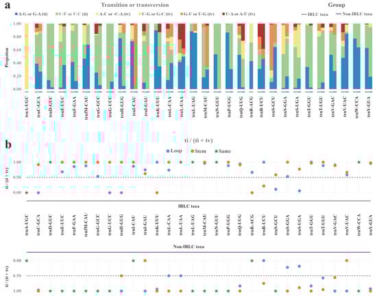 Substitution events of IRLC and non-IRLC pttRNAs. (a) The proportions of six substitution types in 30 isoacceptor pttRNAs. The IRLC and non-IRLC groups were marked with grey and purple boxes respectively. (b) Ratio of ti to (ti + tv) of loop- and stem-located substitutions. The blue and orange dots denoted loops and stems respectively. The pentagrams indicated the case that the loop- and stem-located substitutions possessed the same values of ti/(ti + tv).
