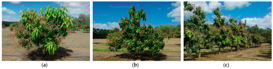The conventional training system (Figure 2a) was used in all three planting density treatments. In these trees, the initial cut was made at 50–65 cm above the ground, one week after field planting, to stimulate lateral branching. Two months after field planting, in February, early summer 2014, three to four of the shoots from the first cut were selected as scaffold branches for the closed vase canopies, typical of young conventional trained trees in Australia. Further branching of the scaffold branches was encouraged by tip pruning approximately every two growth units [,,]. All branches were allowed to grow naturally without any bending. Branches growing across the centre of the tree, dead and diseased branches and the oldest leaves in the centre of the canopies were removed annually to reduce shading and discourage their use as habitats for pests and diseases.