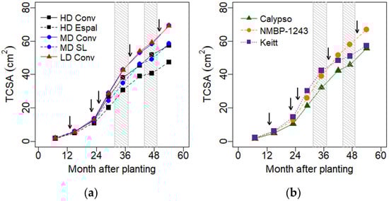 (a) The interaction between planting density, training system and time for trunk cross-sectional area (TCSA) and (b) the interaction between cultivar and time for TCSA. No measure of variability is presented as the data were analysed on the log10 scale, and the back-transformed means are presented. HD, MD and LD: high, medium and low planting density, respectively; Conv, Espal and SL: conventional, espalier, and single leader training systems, respectively. The arrows indicate pruning events. The shaded areas indicate reproductive periods from flowering to harvest.