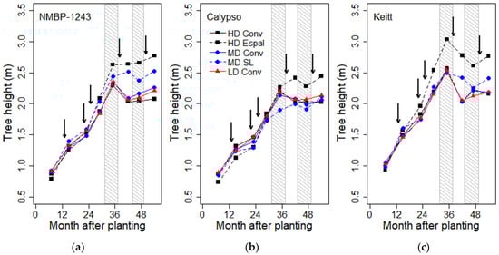 The effect of planting density and training system on changes in mean tree height for three mango cultivars (NMBP-1243 (a), Calypso (b), Keitt (c)) during the first 54 months after planting. No measure of variability is presented as the data were analysed on the log10 scale, and the back-transformed means are presented. HD, MD and LD: high, medium and low planting density, respectively; Conv, Espal and SL: conventional, espalier and single leader training systems, respectively. The arrows indicate pruning events. The shaded areas indicate reproductive periods from flowering to harvest.
