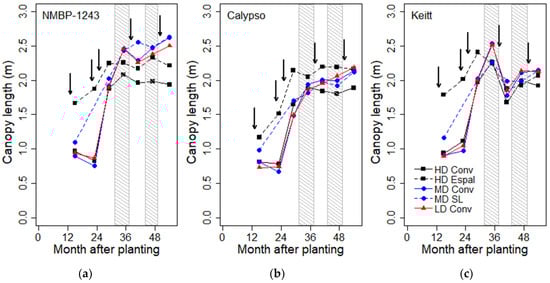 The effect of planting density and training system on the mean canopy length of three mango cultivars (NMBP-1243 (a), Calypso (b), Keitt (c)) during the first 54 months after planting. No measure of variability is presented as the data were analysed on the square root scale, and the back-transformed means are presented. HD, MD and LD: high, medium and low planting density, respectively; Conv, Espal and SL: conventional, espalier and single leader training systems, respectively. The arrows indicate pruning events. The shaded areas indicate reproductive periods from flowering to harvest.