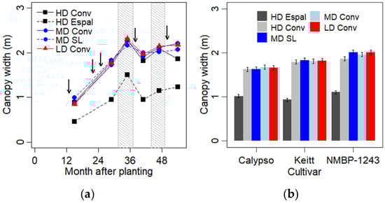 Three-way interactions between (a) planting density, training system and time and (b) planting density, training system and cultivar for tree canopy width. No measure of overall variability is presented in graph (a) as the data were analysed on the square root scale, and the back-transformed means are presented. On graph (b), individual error bars are back-transformed and represent ± 1 standard error. HD, MD and LD: high, medium and low planting density, respectively; Conv, Espal and SL: conventional, espalier and single leader training systems, respectively. On graph (a), the arrows indicate pruning events, and the shaded areas indicate reproductive periods from flowering to harvest.