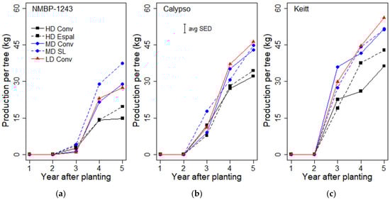 The effect of planting density and training system on the tree production of three mango cultivars (NMBP-1243 (a), Calypso (b), Keitt (c)) during the five first years after planting. The overall average standard error of the difference (avg SED) is given on the centre graph only. HD, MD and LD: high, medium and low planting density, respectively; Conv, Espal and SL: conventional, espalier and single leader training systems, respectively.