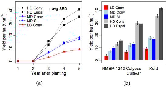 Three-way interactions for orchard yield between (a) planting density, training system and time and (b) planting density, training system and cultivar. HD, MD and LD: high, medium and low planting density, respectively; Conv, Espal and SL: conventional, espalier and single leader training systems, respectively. Avg SED in graph (a): average standard error of the difference; error bars in graph (b) represent ± one standard error.