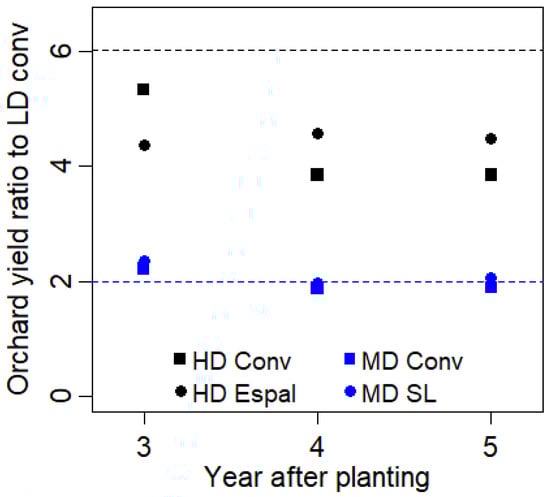 The interaction of density × training × time showed that the increase in orchard yield averaged over the three cultivars differed in relation to the planting density during the three first productive years (Figure 8a). Orchard yield did not increase significantly in the LD conventional training system between years 3 and 5 (Figure 8a). For the two MD training systems, the increases in orchard yield were only significant between years 3 and 5. In contrast, the two HD training systems showed a significant increase in orchard yield between years 3 and 4, but not between years 4 and 5.