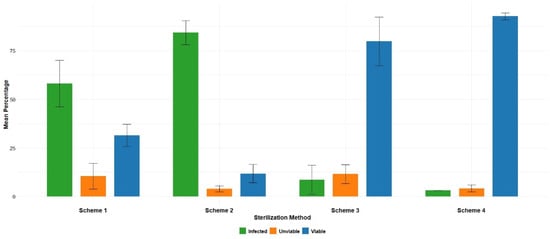 Viability and contamination rates of A. microdictyon seeds depending on the method of sterilization: Scheme 1 (EtOH + H2O2), scheme 2 (EtOH + KMnO4), scheme 3 (EtOH + NaClO), and scheme 4 (EtOH + HgCl2).