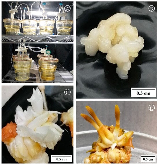 The temporary immersion system installed on a shelf in an incubator providing conditions of 27 ± 2 °C and 50 μmol m−2 s−1 cool-white LED light (A). The three categories of somatic embryogenic material employed in the TIS investigation including callus exhibiting somatic embryogenic structures at the globular stage of development (B), mature somatic embryos in the early stages of germination (C), and clusters of germinated somatic embryos (D).