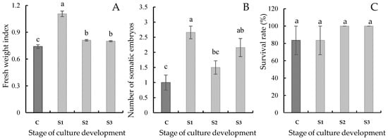 A comparison of somatic embryogenic callus performance when introduced into the temporary immersion system at one of three different developmental stages (S1: consisting of clusters of somatic embryogenic callus at the globular stage of development; S2: consisting of clusters of germinating somatic embryos; S3: consisting of clusters of coleoptilar-stage SEs; and C: a control, consisting of somatic embryogenic callus at the globular embryo stage of development on a solid medium). This comparison was based on three metrics determined after 6 weeks of incubation: (A) the fresh weight gain of the cultured materials, (B) the increase in the number of somatic structures generated, and (C) the survival rate as assessed by the percentage of non-necrotic tissue per culture. Bars represent two standard errors of the mean. Significant differences within each dataset are denoted by different letters positioned above the bars.
