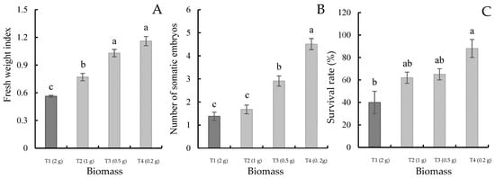 A comparison of somatic embryogenic callus performance when introduced into the temporary immersion system at one of four different biomasses (T1: biomass of 2 g; T2: a biomass of 1 g; T3: a biomass of 0.5 g; and T4: a biomass of 0.2 g). This comparison was based on three metrics determined after 6 weeks of incubation: (A) the fresh weight gain of the cultured materials, (B) the increase in the number of somatic structures generated, and (C) the survival rate as assessed by the percentage of non-necrotic tissue per culture. Bars represent two standard errors of the mean. Significant differences within each dataset are denoted by different letters positioned above the bars.