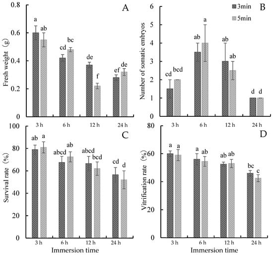 This study was conducted at CATAS. Freshly formed somatic embryogenic callus (0.2 g) at the globular stage of development (6 months after initiation), was inoculated into 12 TIS vessels. In this experiment, two immersion times of 3 or 5 min were applied at intervals of 3, 6, 12, and 24 h. The TIS treatment was applied for 6 weeks to all TIS under constant conditions (27 ± 2 °C; 50 μmol m−2 s−1 cool-white LED light). The performance of the cultures was evaluated by determining the FWI, SEN, SR and vitrification rate (VR). The experiment was a randomized design, with three replicates (5 explants in each) for each of the two immersion times and four periods and using embryos at the globular stage of development.