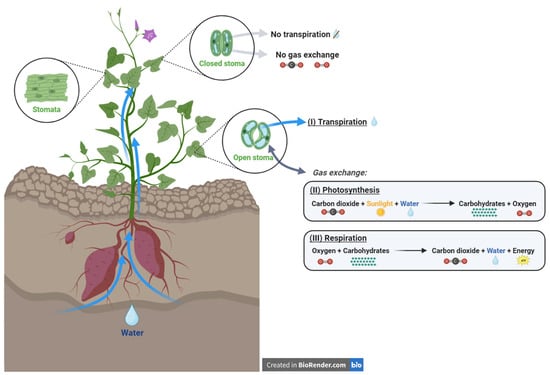 Water is a basic resource for plant life, playing a crucial role in several biochemical and physiological processes essential for plant growth and health. Water is involved in triggering seed germination, facilitating the uptake of minerals and nutrients from the soil, and subsequently transporting them throughout various plant organs [32,33]. Water also assumes a vital role in sustaining turgor pressure, providing rigidity to plant cells, maintaining their shape/vigor, and preventing wilting [32]. Adequate turgor pressure will additionally contribute to opening stomata [34], enabling gases exchange needed for basic physiological processes, such as plant transpiration, photosynthesis, and respiration [35], as illustrated in Figure 1. These processes contribute to preventing plant overheating, producing carbohydrates, and generating energy in the form of adenosine triphosphate (ATP), respectively [13].