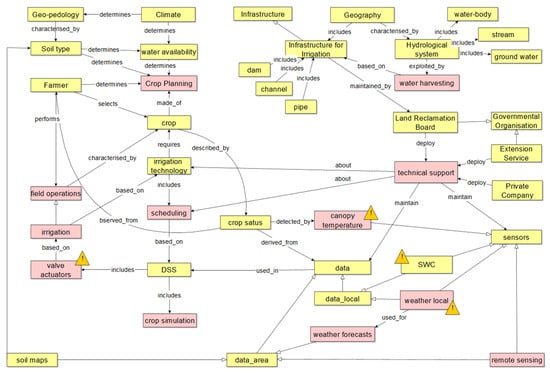 Ontographic representation of most relevant structural (yellow) and dynamical (pink) entities involved in IoT-based horticulture smart irrigation; entities are linked by relation arrows and (open head) subclassing arrows; warning triangles show where IoT devices are commonly in use (SWC: Soil Water Content).