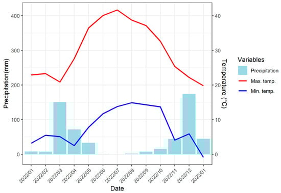 The work was carried out on a 1.1-ha plot located at the IFAPA Center in Cabra, southern Spain (37.502619° N, 4.428879° W, WGS84). This region has an average rainfall of 582 mm·year−1; more detailed meteorological data for the period in which the work was carried out can be seen in Figure 1.