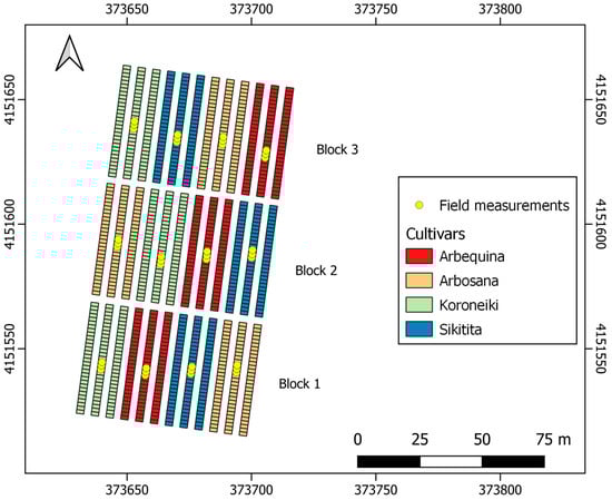 Map showing the distribution of the olive trees and cultivars in the experimental field together with the positions of the trees measured in the field (Coordinate Reference System: WGS84, UTM 30N).