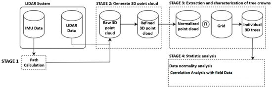 The workflow for the generation and analysis of the LiDAR point cloud consisted of the following main steps (Figure 3):