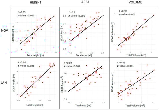 The statistical analysis of the means revealed that, in November, the only variable that did not show significant differences between the field and the LiDAR estimations was the volume, when using the formula of an elliptic cylinder. In January, there were two variables with no differences associated with the measurement method: the area and the volume calculated using the formula of an ellipsoid. Due to the normality of the data, all the mean comparisons were carried out using the paired samples t-test, except for the height in November, where the Wilcoxon test was used because it did not meet the normality assumption.