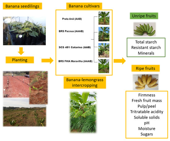 The importance of diversifying banana cultivars and the potential of the intercropping system to improve the sustainability of banana fields requires studies to characterize the impact of these methods on fruit quality. Therefore, this study evaluated the effects of banana cultivars, cropping systems (monocropping and intercropping with lemongrass), and the interaction between these factors on the physicochemical characteristics of ripe and unripe fruit.