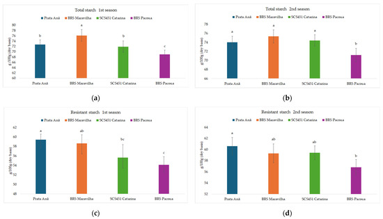 Total starch (a,b) and resistant starch (c,d) contents of unripe fruit pulp of banana cultivars. Means followed by the same letter in the bars of each season do not differ, according to Tukey’s test.