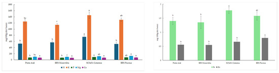 - Minerals: the content of nitrogen (N), phosphorus (P), potassium (K), calcium (Ca), magnesium (Mg), iron (Fe), and zinc (Zn) in the dehydrated samples of unripe banana pulp were determined according to the method described by Malavolta et al. [20]. The N content was determined using sulfuric acid (H2SO4) digestion and quantified using the semi-micro Kjeldahl method. P, K, Ca, Mg, S, Cu, Fe, Mn, and Zn contents were determined by atomic absorption spectrophotometry (Analyst 800, Perkin Elmer, Shelton, CT, USA) after nitric acid (HNO3)—perchloric acid (HClO4) digestion. The results were expressed as mg 100 g−1 (dry basis).
