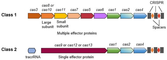 Illustration of the generic organizations of the class 1 and class 2 CRISPR/Cas loci. Class 1 systems have effector modules composed of multiple Cas proteins that function in protein complex during the editing. Class 2 systems have a single, multidomain effector protein that is functionally analogous to the effector protein complex of class 1. Some of the class 2 systems like Cas9 proteins require trans-acting CRISPR RNA (tracrRNA).