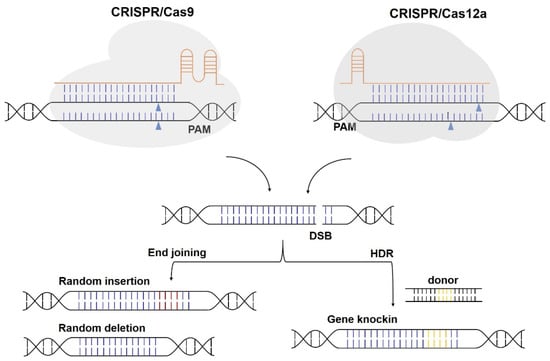 Genome editing induced by CRISPR/Cas9 and CRISPR/Cas12a. Both CRISPR/Cas9 and CRISPR/Cas12a generate double-stranded break (DSB), which can be repaired via end joining or the homology-directed repair (HDR) pathway, resulting in indel (random insertion or deletion) or knock-in mutations. The inserted nucleotides via end joining and desired mutations carried by donor template are indicated in red and yellow, respectively.