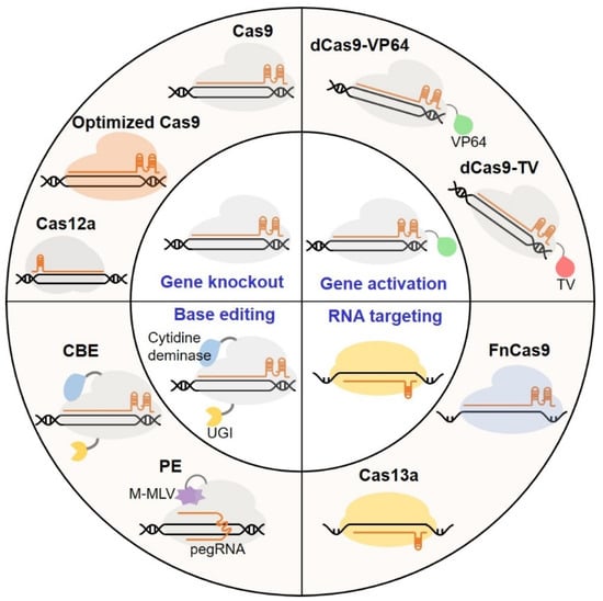 Prior to CRISPR/Cas9, zinc-finger nucleases (ZFNs) and transcription activator-like effector nucleases (TALENs) had been developed to target genomic sites of interest for gene editing [8,9,10]. In the two systems, DNA-binding domains are fused with the FokI nuclease domain, which should form a dimer to activate the nuclease activity, thereby cutting the target DNA sequence to create a double-stranded break (DSB) [11]. However, both of the two systems rely on protein–DNA interactions, and new proteins should be engineered for targeting different sites, which is usually labor-intensive, precluding the applications of ZFNs and TALENs. In contrast, Cas9 protein is an RNA-guided site-specific nuclease and recognizes target DNA sequence by forming Watson–Crick base pairings with its guide RNA [11]. In theory, Cas9 could be programmed to target different sites just by changing the guide RNA. To date, CRISPR/Cas9 has been the primary CRISPR tool for genome editing in both animals and plants.