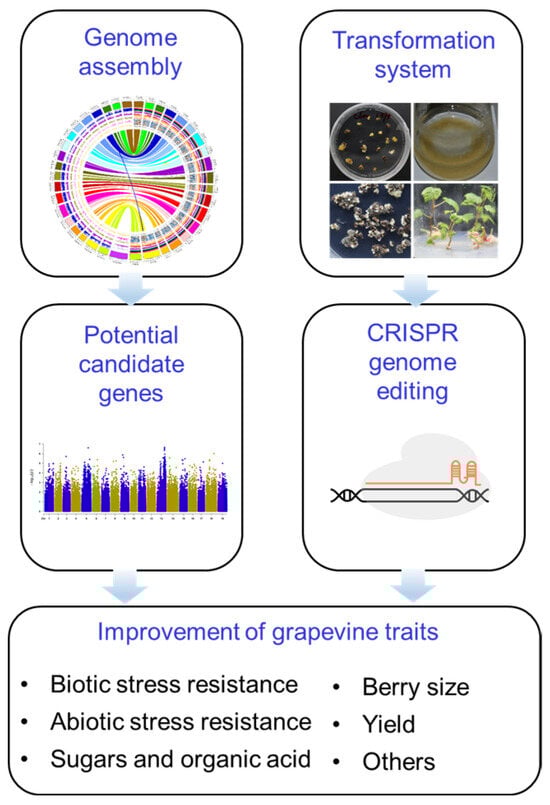 A strategy for accelerated improvement of grapevine traits. Bioinformatics analysis based on sequencing data and grapevine phenome provides candidate genes, and CRISPR editing, together with grape transformation system, enables a rapid verification of gene functions. The results pave the way for improvement of different grapevine traits.