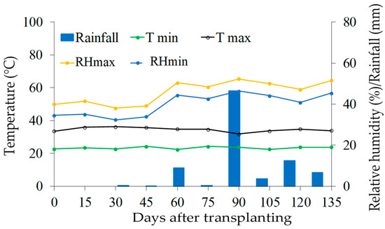 During the experimental period, climatological data on temperature, relative humidity, and precipitation (Figure 1) were collected through the Agritempo website [35].