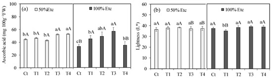 Figure 2. Ascorbic acid content (a) and luminosity (*L) of color (b) in green pepper fruits, as a function of irrigation depths and water deficit alleviating treatments. Control—no product application, T1 = ZnSO4 via leaves, T2 = ZnONPs via leaves, T3 = ZnONP via leaves + PGPB via soil, T4 = ZnSO4 via soil + PGPB via soil. Bars with the same lowercase letters do not differ for water stress, and bars with the same uppercase letters do not differ for DHA treatments by Tukey’s test (p ≤ 0.05). Vertical bars represent the standard error.