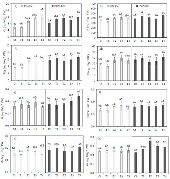 Figure 3. Contents of calcium (a), potassium (b), magnesium (c), phosphorus (d), boron (e), iron (f), manganese (g), and zinc (h) in green pepper fruits, as a function of irrigation depths and treatments to alleviate water deficit. Control—no product application, T1 = ZnSO4 via leaves, T2 = ZnONPs via leaves, T3 = ZnONPs via leaves + PGPB via soil, T4 = ZnSO4 via soil + PGPB via soil. Bars with the same lowercase letters do not differ for water stress, and bars with the same uppercase letters do not differ for DHA treatments by Tukey’s test (p ≤ 0.05). Vertical bars represent the standard error.