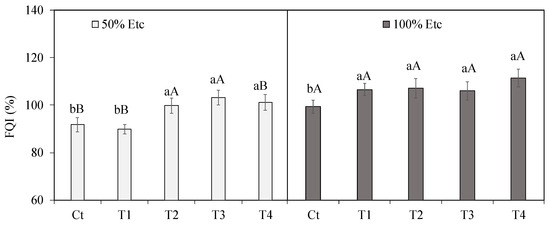 Figure 4. General fruit quality index (FQI) of green pepper, as a function of irrigation depths and water deficit alleviating treatments. Control—no product application, T1 = ZnSO4 via leaves, T2 = ZnONPs via leaves, T3 = ZnONPs via leaves + PGPB via soil, T4 = ZnSO4 via soil + PGPB via soil. Columns with the same lowercase letters do not differ for water stress, and bars with the same uppercase letters do not differ for combinations involving zinc oxide nanoparticles (ZnONPs) or bioinoculants (PGPB) by Tukey’s test (p ≤ 0.05). Vertical bars represent the standard error.
