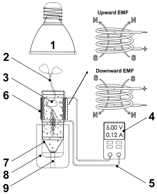 Schematic representation of the EMF application system for plant-growth control: (1) light source, (2) plant shoots, (3) seeds and roots, (4) power supply, (5) electric wires, (6) solenoid coil, (7) cultivation pot, (8) pot holder, and (9) water drain. “N” and “S” in the figure indicate the direction of EMF application in the system: the direction can be altered by reversing the connection of the electric wire to the power supply.