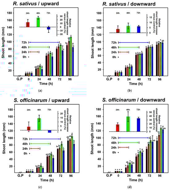 Effects of different EMF application directions (EMF upward (a,c) and EMF downward (b,d)) on shoot growth (R. sativus and S. officinarum). The colored arrows in the figures indicate the effective EMF application periods after the seed germinations. The color codes in the plots indicate the measurement results with different EMF application periods (black dot: 0 h, red: 24 h, green: 48 h, blue: 72 h). The inner (upper) graphs indicate that the relative shoot length increased after 96 h of cultivation with different EMF application times and directions from early shoot growth (after germination). Different lowercase letters indicate significant differences (p < 0.05).
