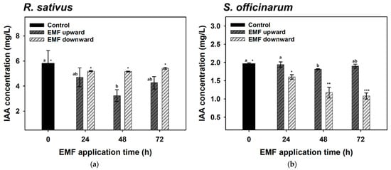 Effects of EMF application on IAA concentration in plants (R. sativus (a) and S. officinarum (b)). Results were obtained after 96 h of cultivation. Whole plants were used for IAA analysis. Different lowercase letters indicate significant differences (p < 0.05).