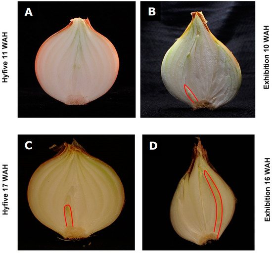 Longitudinal sections of bulbs from two onion cultivars at two different time points during storage. Pictures show cross-sections of Hyfive (A) and Exhibition (B) bulbs at 11 and 10 weeks after harvest (WAH), and of Hyfive (C) and Exhibition (D) bulbs at 17 and 16 WAH, respectively. The red lines in pictures (B–D) highlight the internal sprouts. No internal sprout was present in picture (A).