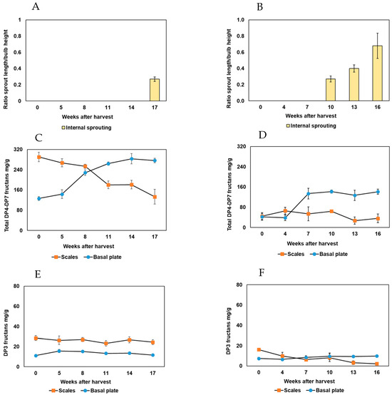 Internal sprouting and fructan profiles during dry storage of cv. Hyfive and Exhibition onion bulbs. Storage time is indicated as weeks after harvest (WAH). (A,C,E) Measurements for Hyfive. (B,D,F) Measurements for Exhibition. In panels (A,B), the internal sprouting is plotted as the ratio ‘sprout length/bulb height’ (yellow bars); in panel (C,D), the DP4-DP7 fructan concentrations, and in panel (E,F), the DP3 fructan concentrations, are plotted in milligram (mg) fructans per gram (g) of dried scale or basal plate material (dry weight). The internal sprouting ratio and the fructan values are the mean values of three biological replicates. Error bars represent the standard error of the mean values.