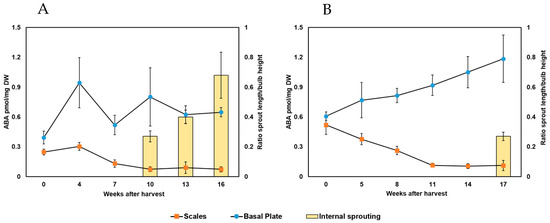In previous research, depletion of the hormone abscisic acid (ABA) within the onion bulb has also been proposed as a potential trigger of internal sprouting [7,8,9]. ABA is involved in many growth and developmental processes widely associated with abiotic stress response, senescence, and dormancy in various crops [10]. ABA functions after cellular recognition via specific receptors in a tissue-specific manner [11,12]. In onion, ABA gradually accumulates in the bulb during the first year of the life cycle [9]. Measurements using complete bulbs after harvest revealed that ABA is progressively depleted during storage [13], and more specifically in the scales, which represent the most abundant tissue [7,8,9,14]. A recent study described that, in contrast to what occurs in the bulb scales, ABA levels do not decrease proportionally in the basal plate tissue [15]. This finding suggests that, if there is a relationship between sprouting and ABA levels, it is likely complex and probably tissue-specific.