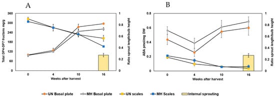 Effects of Maleic Hydrazide (MH) treatment on internal sprouting, DP4-DP7 fructan profiles, and ABA profiles in scales and basal plates of onion cv. Hyfive bulbs. (A) DP4-DP7 fructan profile and (B) ABA profile in the basal plates of MH-treated (grey circles) and untreated (UN) control bulbs (orange circles), and the bulb scales of MH-treated (blue squares) and UN control bulbs (yellow squares) at four time points during dry storage. DP4-DP7 fructan values are the mean values of three biological replicates, depicted in mg per g of dry weight. ABA concentration values are the mean values of three biological replicates, depicted in pmol per mg of dry weight. Error bars represent the standard errors of the mean values. The yellow bar refers to internal sprouting, expressed as the ratio between ‘sprout length and bulb height’. Internal sprouting was only present in the UN samples, whereas no internal sprouting was observed in the MH-treated bulbs. Independent T-test showed that average fructan (DP4-DP7) and ABA concentrations are not statistically different (p > 0.05) between the UN and MH-treated onion bulbs.
